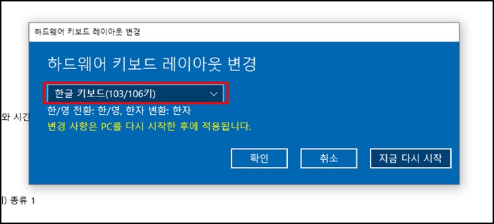가운데 위와 같이 키보드 레이아웃 변경이라는 팝업이 뜨게 됩니다. 여기에 나와있는 키보드 설정이 나와 맞게 설정되어야 하는데 키보드에 한영 키가 있는 분이라면 위 설정이 아닌